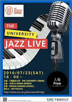 The University DININGで初めてのJAZZ LIVEです。ピアノ、ベース、ボーカル、ドラムス、テナーサックスの5人編成で休憩を含め3ステージの予定。入場フリー。お子様も含めどなたでも大歓迎です。ソフトドリンク、ビール、ワイン、軽食を有料にて楽しめます。