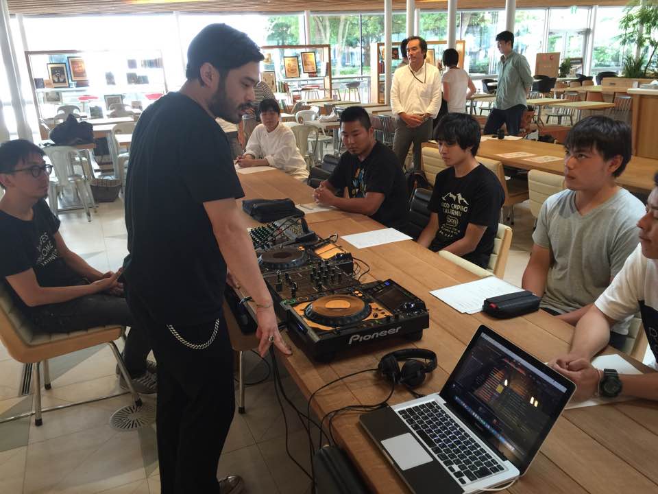 写真は8月からスタートした学生DJ育成プログラムでインストラクターをしているところです。写真左は一緒に指導していただいているミュージックセレクターの北郷満春さん。ここからDININGやHUB で活躍する学生DJが誕生します。