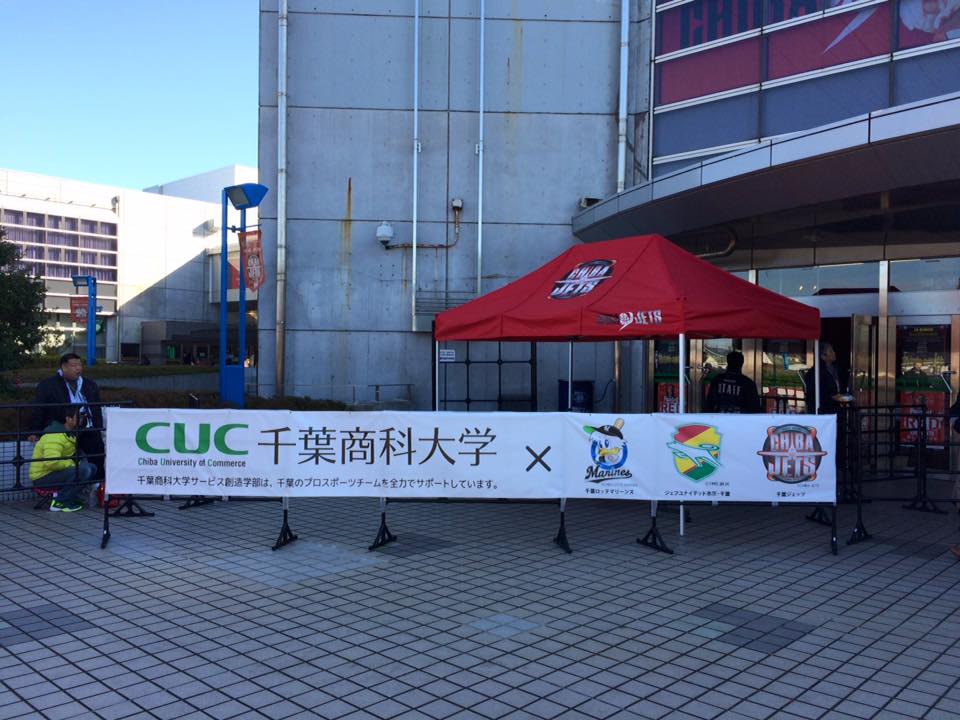 本年9月スタートしたプロバスケットボールの「Bリーグ」。サービス創造学部が球団設立前から応援する「千葉ジェッツ」の大学冠試合、千葉商科大学マッチデーが本日、明日の両日、船橋アリーナで開催されます。冠試合は今年で6回目です。写真は準備が進む船橋アリーナ前です。