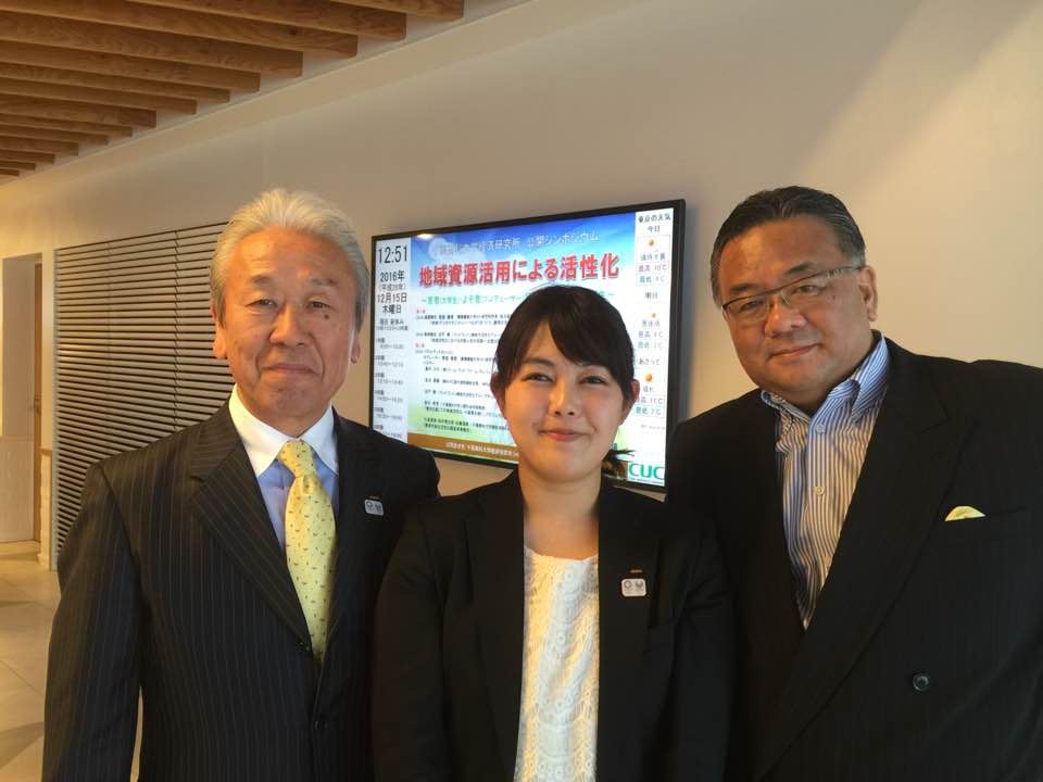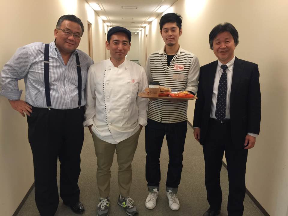 ★本館4階の学部長室前での記念写真です。左から学部長、浅本充さん(自由が丘ベイクショップ経営の株式会社ユニテ代表取締役社長、DININGベーカリー監修)、Transit General Office Inc.の林さん(DININGベーカーリーコーナー担当)、西尾教授です。木曜日は、新年にThe University DININGで販売するミルフィーユとフカッチャを浅本さんと林さんがDININGキッチンで試作。それらを学部長室で試食させていただきました。大学でこんなうまいベーカリーが食べれるなんて夢のようです。ご期待ください。浅本さんには、DININGのベーカリーやスープを監修していただいています。現場担当の林さんとの連携もバッチリです。DININGで美味しいベーカリーやスープを賞味いただけるのも浅本さんの貢献大です。この他にも経済産業省採用事業のひとつ「世界一のキャンパスアイスクリーム」づくりにも協力していただいています。NYのアイスクリーム起業家、Van Reween のBENさんを紹介いただき、10月にはスカイプを使ってNYと大学の教室を結び、BENさんにアイスクリーム企業やアメリカのアイスクリーム文化についてレクチャーしていただきました。新年には浅本さんがアイスクリームプロジェクトの学生たちにアイスクリームレクチャーを予定しています。学生たちにとっては食文化を学ばせていただいている兄貴です。7月にはDININGで浅本さんの写真展も開催させていただきました。