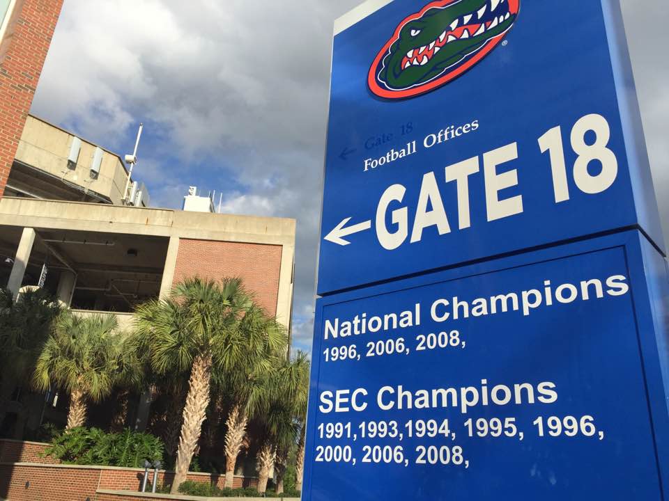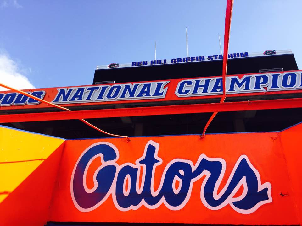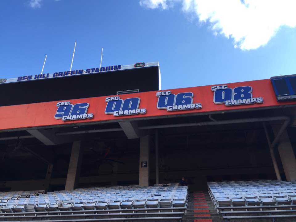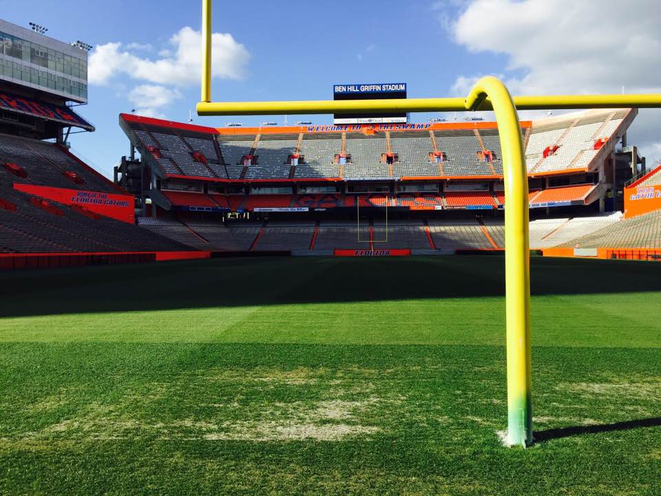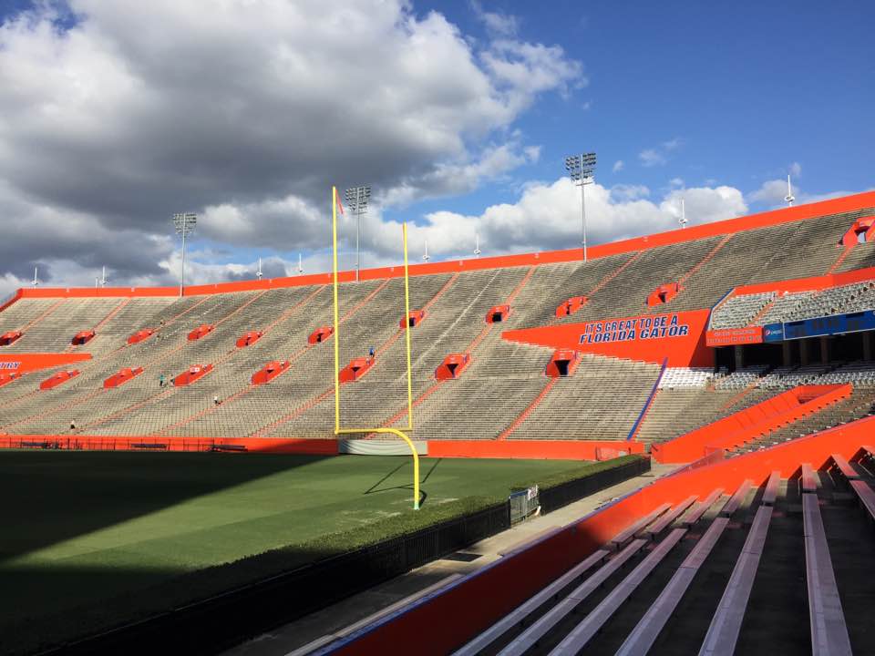 8万人収容のアメフト専用スタジアム。UFの学生数5万3千名を超える収容人数です。シーズン中のホーム試合には卒業生や教職員を含めこのスタジアムが超満員になります。大学教授でもチケットを確保するのは大変です。Gator Footboolチームは、ブラスバンド、チアリーダー、大学関係者と一緒にチャーター機で移動します。